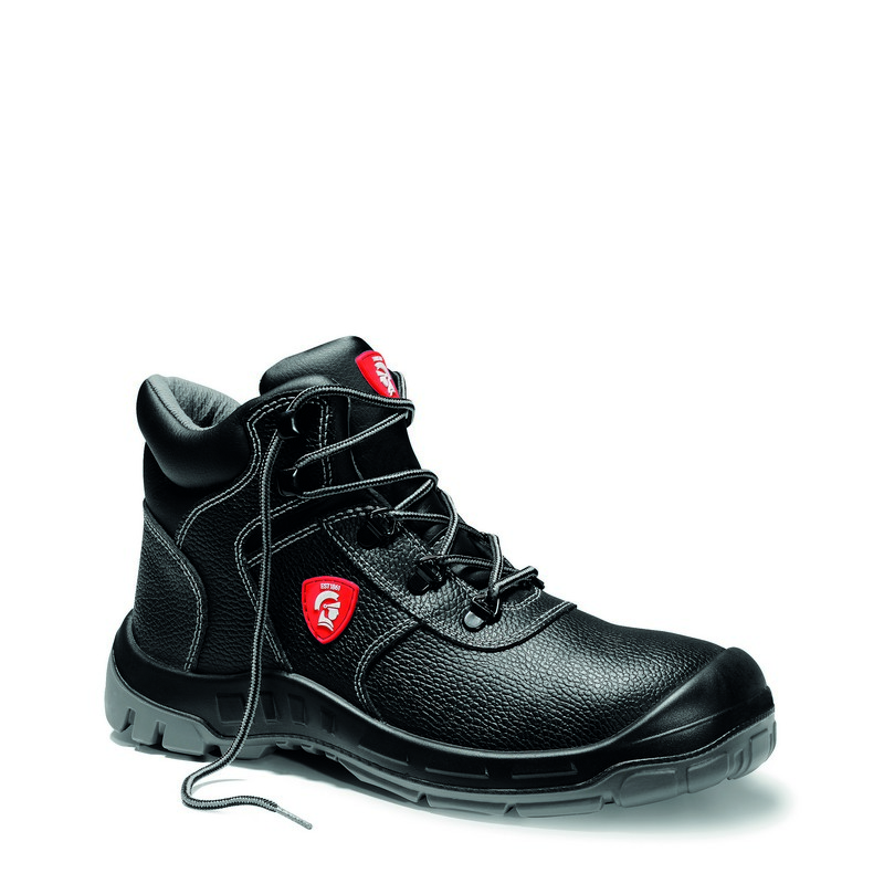 Semelle intérieure amovible. Embout de protection en PU contre l’usure. Chaussure de chantier. Doublure textile respirante. Tige en cuir de vachette pleine fleur. Semelle PU/PU. Embout et semelle intermédiaire en acier. Modèle montant.