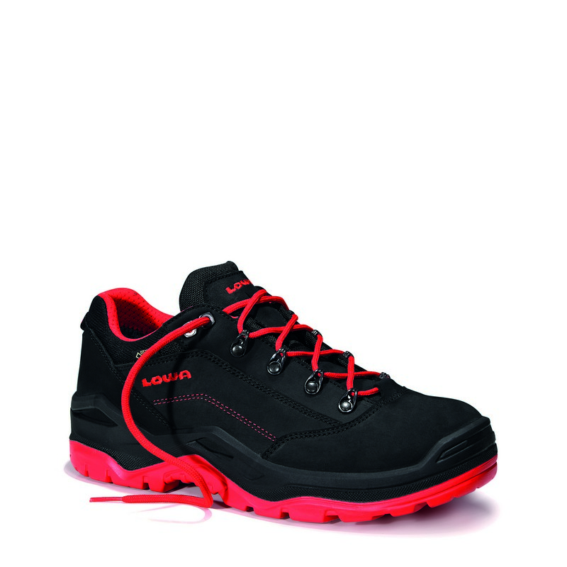 Cuir nubuck hydrophobe/textile. Imperméable. Doublure Gore-Tex respirante, imperméable et thermorégulatrice. Semelle intérieure entièrement amovible. Languette rembourrée pour l’eau. Semelle extérieure Vibram en caoutchouc/PU. Bonne adhérence. Semelle intermédiaire sans métal et embout en acier. Coloris noir/rouge. Modèle bas.