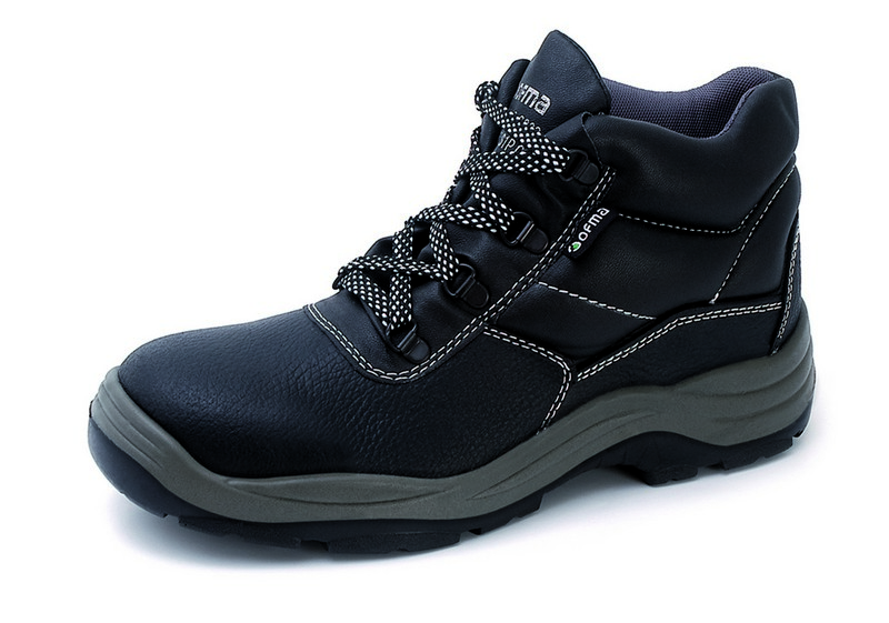 Cuir fendu. Doublure textile douce. Semelle extérieure double couche en PU. Modèle montant. Embout et semelle intermédiaire en acier.