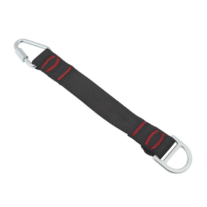 Rallonge avec anneau en D et crochet triangulaire à vis pour fixation à l’arrière du harnais. Largeur de la sangle : 45 mm. Longueur : 40 cm.