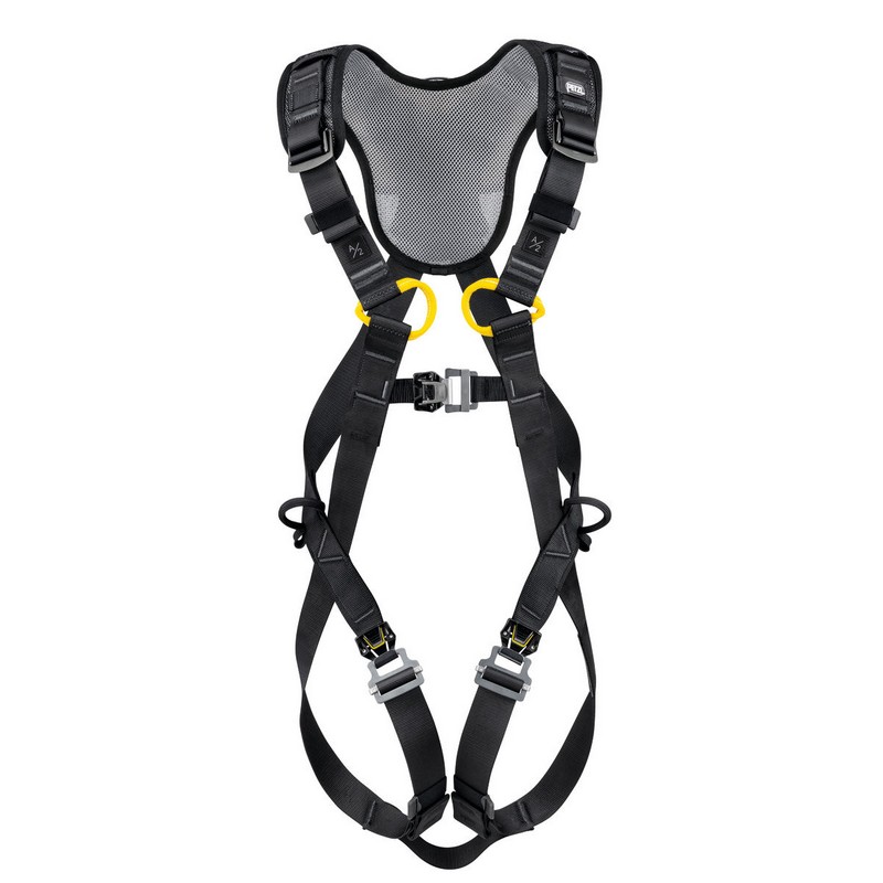 Ergonomique. Boucles à ouverture rapide. Bretelles rembourrées. Deux porte-matériel et deux passants pour la sacoche à outils Petzl. Coloris jaune/noir. Taille 1 (S/M).