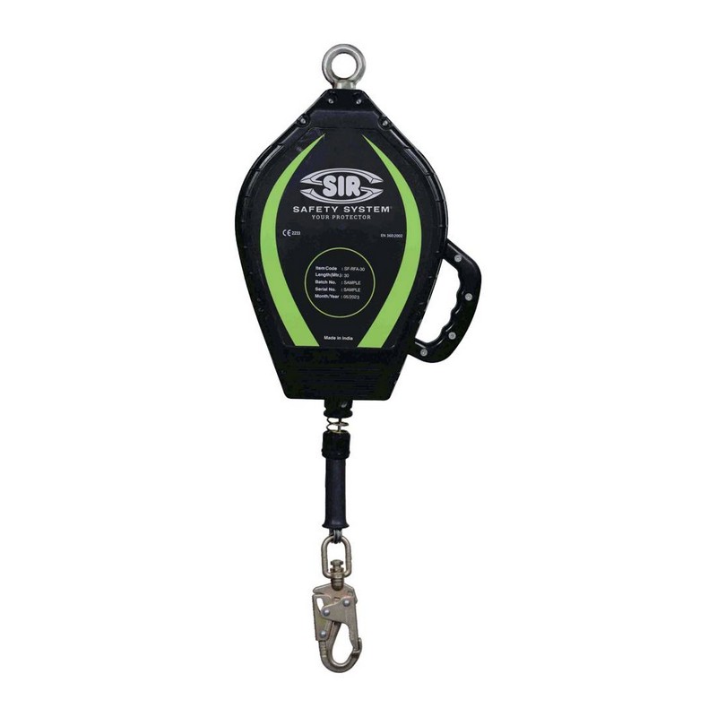 Protection maximale en cas de chute grâce à une distance de freinage réduite et une grande mobilité. Câble en acier galvanisé à enroulement automatique. Amortisseur de chute intégré. Crochet autobloquant. Avec poignée. Bloc de protection en plastique renforcé de métal. Poids maximal de l’utilisateur : 100 kg. Longueur : 30 mètres.