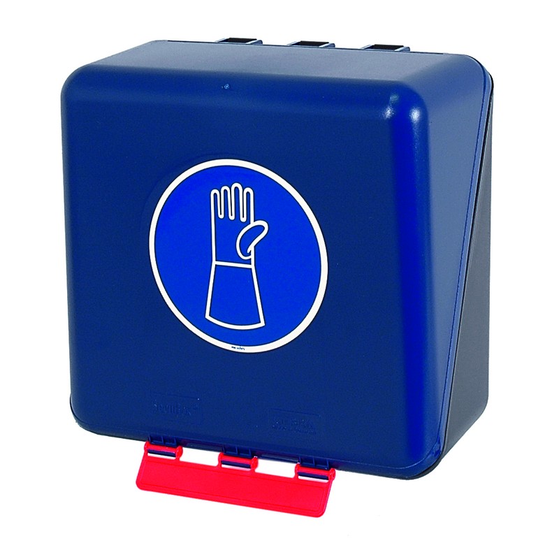 Armoire de rangement bleue avec pictogramme « Gants de travail avec protection des poignets » intégré ou amovible.