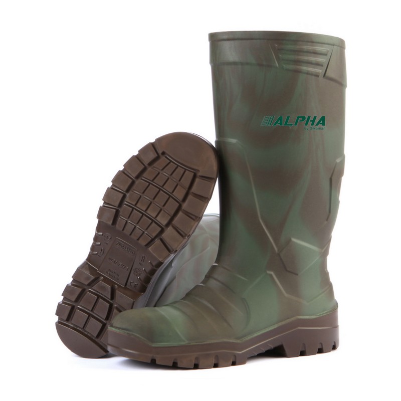 Idéal pour la sylviculture ou la chasse. Semelle antidérapante résistante. Souple et très résistante aux basses températures jusqu’à -20 °C. Facile à nettoyer. Semelle intérieure amovible. Résistant aux huiles, graisses, acides et solvants organiques. Qualité PU. Embout de sécurité non inclus. Tige camouflage vert/semelle marron.