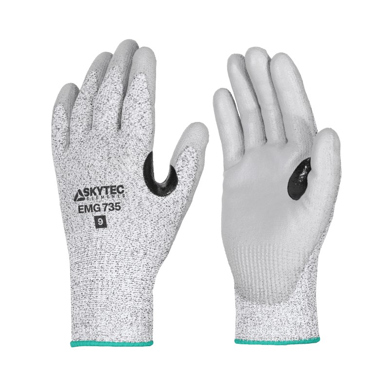 Gant de travail anti-coupure avec revêtement en polyuréthane. Renfort entre le pouce et l’index. Dos ventilé. Couleur : gris.