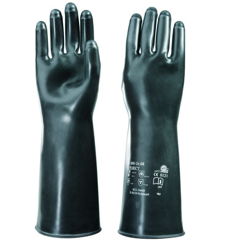 Résistant aux produits chimiques très dangereux et aux rayonnements radioactifs. Étanchéité aux gaz (conforme aux exigences de l’OTAN). Bord roulé. Surface lisse. Intérieur poudré. Longueur : 34-36 cm.