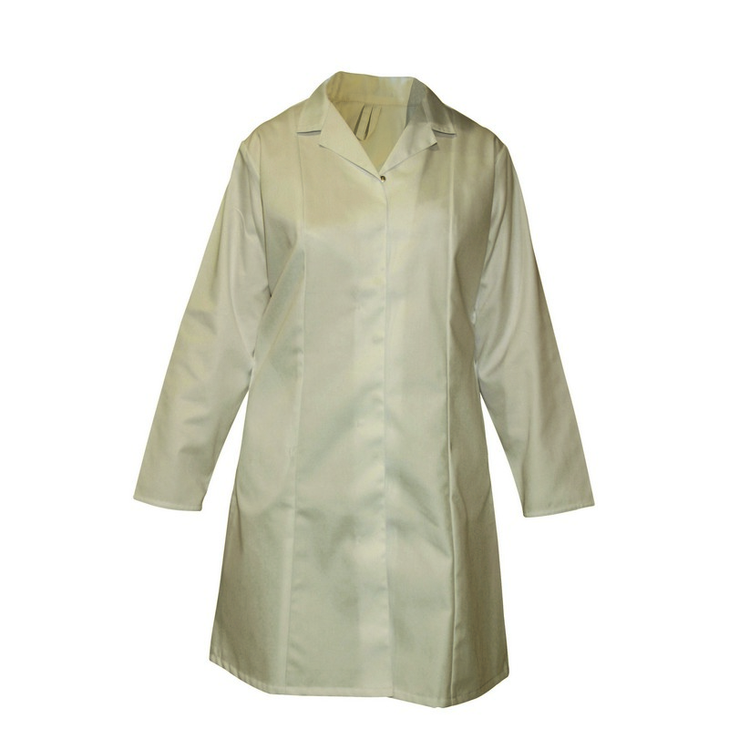 Avec col. Manches montées devant et dos. Fermeture à 7 boutons-pression dissimulés sans patte. 2 poches latérales droites en même tissu. Sans boutons-pression aux manches.