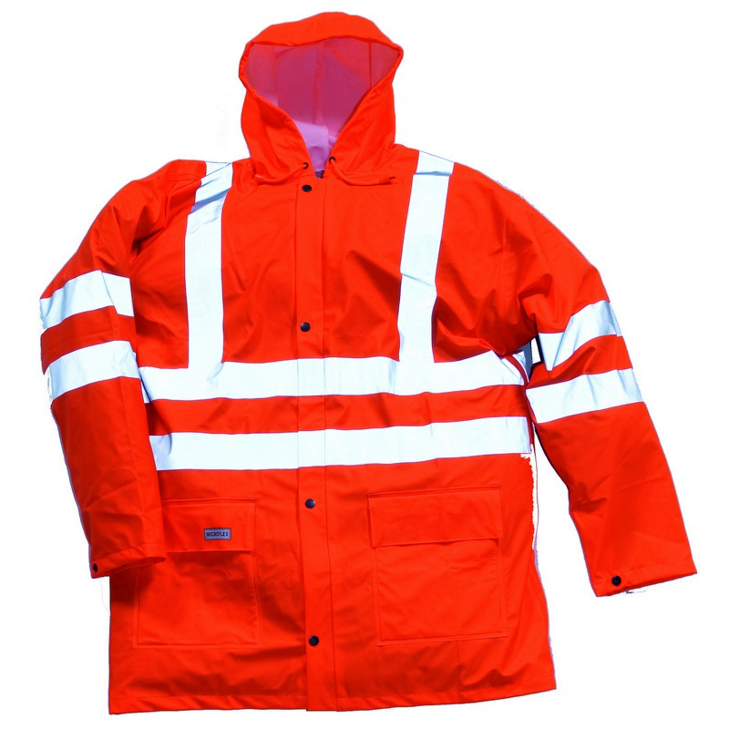 Veste imperméable Microflex haute visibilité. Coutures soudées haute fréquence. Capuche fixe avec cordon de serrage. Fermeture éclair sous rabat anti-tempête avec boutons-pression. Ajustement par boutons-pression aux poignets. Deux poches droites. Éléments réfléchissants 3M.