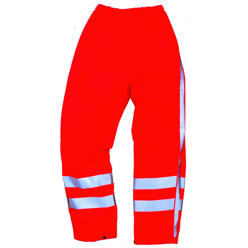 Taille élastiquée. Deux poches latérales. Coutures soudées haute fréquence. Fermeture réglable par bouton-pression en bas des jambes. Imperméable, respirant, léger et souple. Bandes réfléchissantes 3M Scotchlite.