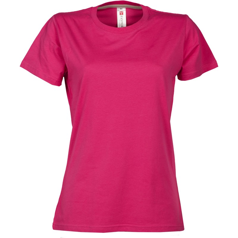 T-shirt femme à manches courtes et col rond, près du corps. Bord-côte de 1,5 cm en élasthanne avec surpiqûres apparentes. Bande de renfort contrastante visible à l’intérieur du col, d’épaule à épaule. Coutures élastiquées. Coutures latérales.