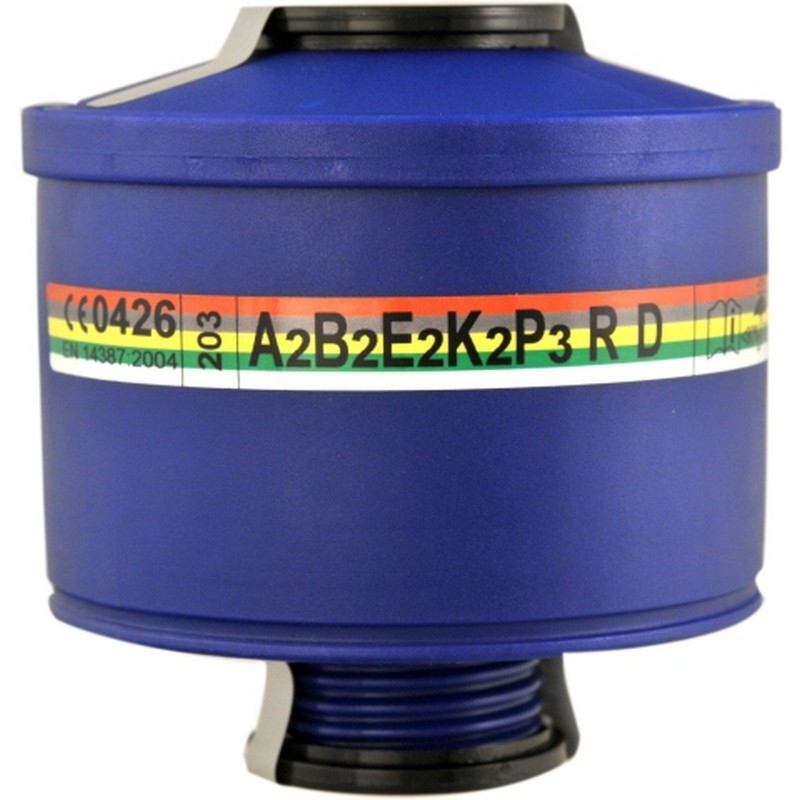 Filtre A2B2E2K2P3 R D pour masque TR82. Boîtier de filtre léger en plastique. Raccord à vis DIN conforme à la norme EN148-1.