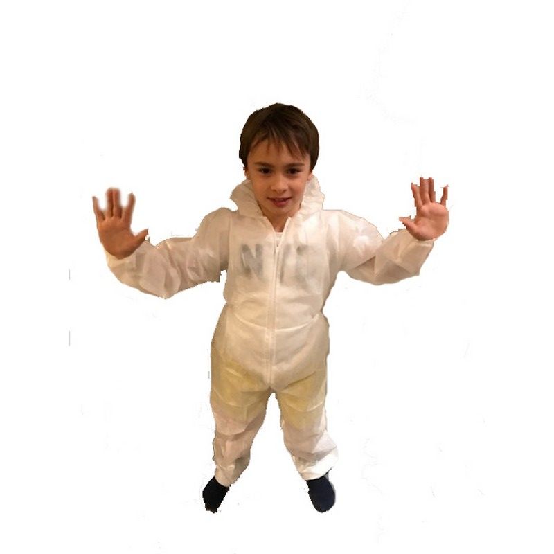 Combinaison jetable spécialement conçue pour les enfants. Protection légère et simple. Avec capuche. Poignets, capuche et chevilles élastiqués. Fermeture éclair. Couleur blanche. Idéale pour les fêtes d’enfants, les carnavals, les écoles…